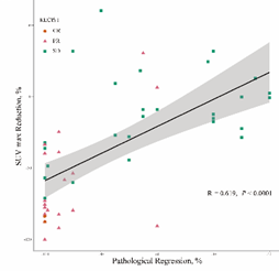 78例入组的患者中,61例(78%)术前行PET-CT评估。SUVmax下降与病理缓解(R=0.619,P<0.0001)之间存在显著相关性。根据ROC曲线,SUVmax下降率为-32%,预测MPR的敏感度(93%)和特异度(91%)最高。(图3)