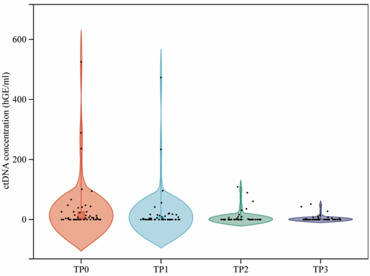 研究比较了不同时间点的ctDNA浓度和ctDNA动态变化(图6)。随着新辅助治疗的进行,未达到pCR/MPR的患者术前ctDNA浓度高于达到pCR/MPP的患者;就ctDNA动态变化而言,与未达到MPR/pCR的患者相比,MPR/pCR患者在TP2和TP3时ctDNA阳性患者百分比显著降低(图7)。